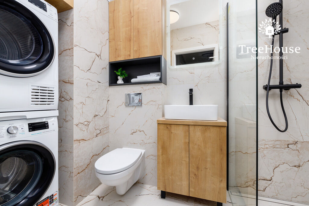 prysznic oraz pralkę z suszarką bębnową. Na przedpokoju stała
