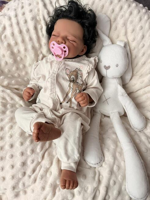 Piękna lalka Reborn o ciemnej karnacji w zestawie z butelką , smoczkiem magnetycznym , certyfikatem narodzin, pampersem ...
