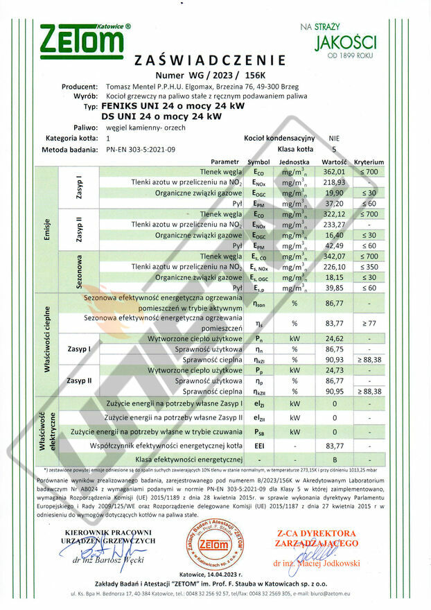 co potwierdza wysokie własności ekologiczne kotła na europejskim poziomie.