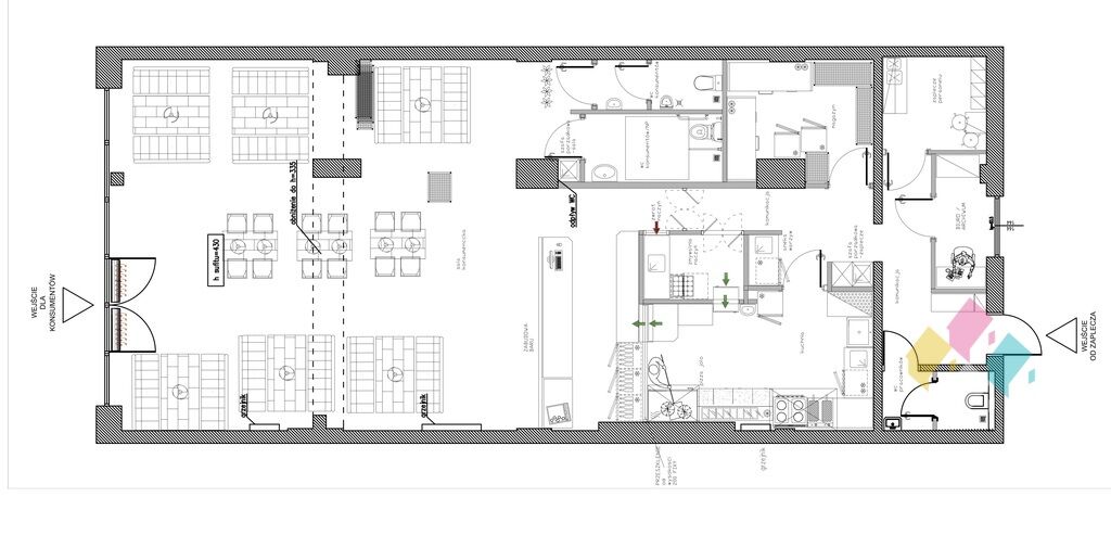 restauracyjną), WCx 2, kuchni, zaplecze magazynowego, szatni oraz