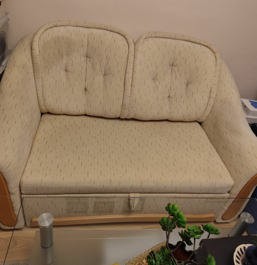 Meble pokojowe, szer. regałów 145, 2 regały szer. 97 i słupek 49. Cena 900 zł . Kanapa dwuosobowa z małym pojemnikiem plus 2 fotele. Jeden fotel na oparciu jest uszkodzony. Cena 400 zł. Stolik szklany 70×110. Dolna półka małe uszczerbienie. Cena 300 zł.Iwona