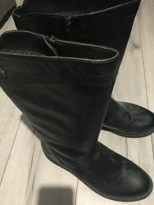 Sprzedam NOWE botki buty kozaki skórzane zimowe damskie zapinane na zamek z cholewką na futerku koloru czarnego. Wygodne, ...