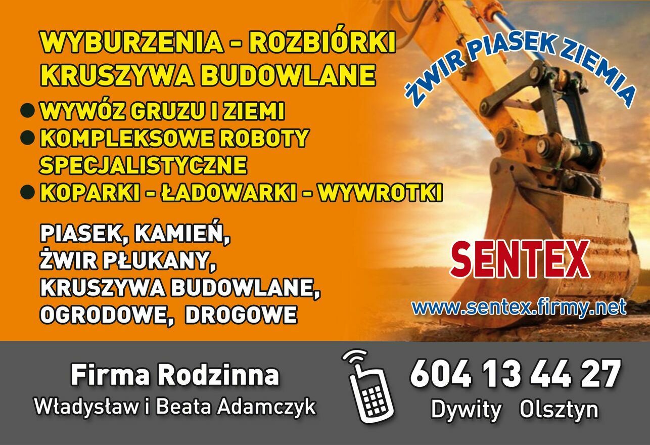 kruszywa budowlane drogowe ogrodowe sprzedaż transport wywrotki małe i większe o zróżnicowanym tonażu koparki ładowarki ze specjalistycznym osprzętem Olsztyn Dobre Miasto Barczewo Wójtowo Stawiguda Dorotowo Tomaszkowo Jonkowo Dywity sząbruk żwir drenażowy kamień otoczak płukany 16/32mm 8/16mm piasek piach płukany siany 0/2mm 0/4mm kamień łamany kliniec grys kamienny mieszanka stabilizacyjna stabilizacja 0/31,5 mieszanki piaskowo kamienne gruz kruszony przekrusz gruzu beton kruszony kruszbet ziemia ogrodowa czarnoziem czarna ziemia ziemia do ogrodu ogrodowa humus ziemia polna na podniesienie terenu pospółka wywóz gruzu ziemi z załadunkiem gruz ziemia BDO KPO wyburzenia rozbiórki obiektów budowlanych firma wyburzeniowa żwirownia Olsztyn Dywity Jonkowo Dobre Miasto Stawiguda Barczewo transportowa transport kruszywa piasku żwiru kamienia budowa dróg gruntowych drogi dojazdowe z gruntu utwardzanie placów parkingów wystarczy zadzwonić a nasze wywrotki firmy sentex Olsztyn dostarczą zamówione kruszywo na wskazany adres zapewniamy transport kruszywa piasku żwiru kamienia ziemi czarnoziemu jego sprzedaż fachowe doradztwo Firma rodzinna sentex Olsztyn 25lat na rynku w Olsztynie dla państwa