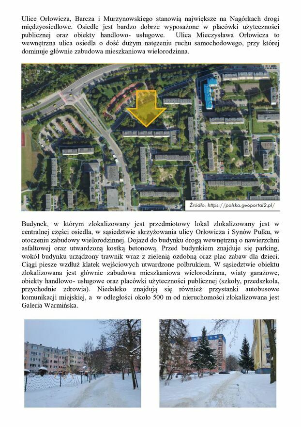 Sprzedaż prowadzona jest w formie konkursu ofert. Oferty należy składać osobiście lub za pośrednictwem operatora pocztowego - w Kancelarii Notarialnej Zbigniewa Stankiewicza w Olsztynie przy ul. Dąbrowszczaków 18/4, tel. (89)527 32 30 albo wysłać e-mailem na adres @ - w terminie do dnia 31 marca 2026r. Oferty wysłane e-mailem winny być podpisane podpisem kwalifikowanym, e-dowodem albo profilem zaufanym. Rozstrzygnięcie konkursu ofert nastąpi w dniu 8 kwietnia 2026r. O wyniku oferenci zostaną powiadomieni listownie i elektronicznie. Przystąpienie do konkursu oznacza zapoznanie się z regulaminem konkursu oraz stanem technicznym nieruchomości i ich akceptacją. Syndyk zastrzega sobie prawo unieważnienia konkursu bez podania przyczyn. Szczegółowe informacje oraz regulamin konkursu ofert są dostępne w Internecie na stronie www.syndykolsztyn.eu. Nieruchomość można oglądać po uprzednim uzgodnieniu terminu z p. Robertem Osowskim tel. 606 - pokaż numer telefonu - . Tel. do syndyka 502 - pokaż numer telefonu - .