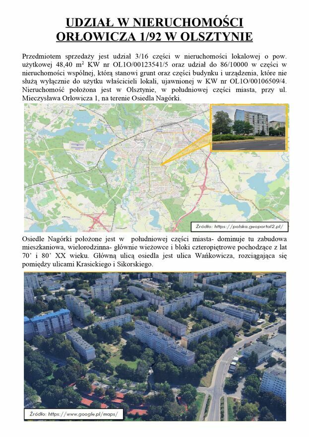 • udział 3/16 części w nieruchomości lokalowej ujawnionej w księdze wieczystej nr OL1O/00123541/5, położonej w Olsztynie przy ulicy Orłowicza 1 m 92, województwo warmińsko-mazurskie - za cenę nie niższą niż ¾ wartości oszacowania tj. 39.750 zł (wartość wg oszacowania 53.000 zł)