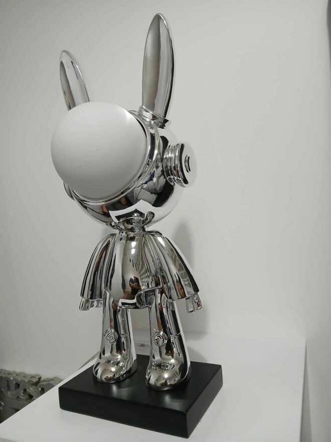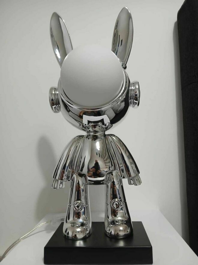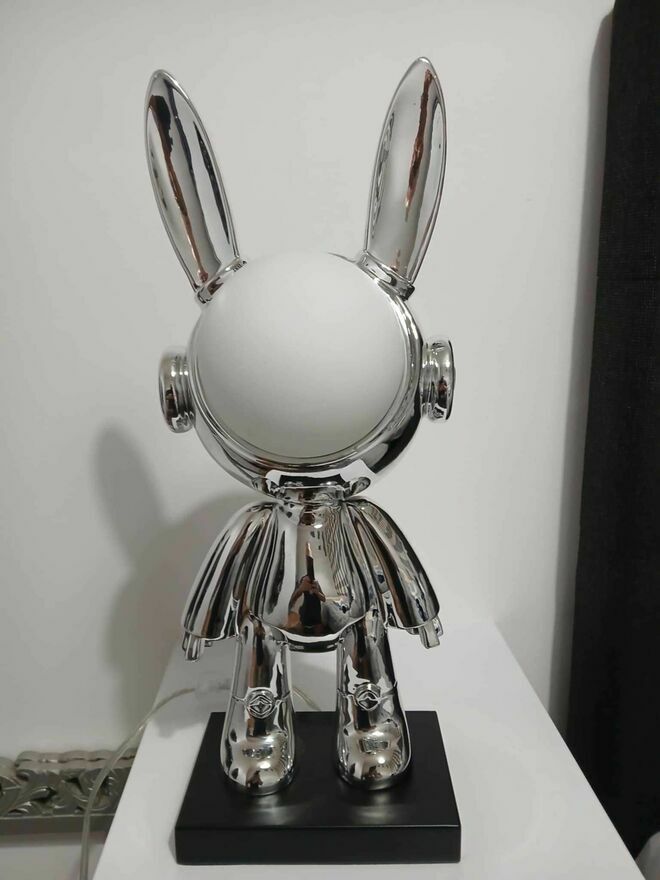 Unikatowa, lampka, chromowana figurka królika. Wykonana z wysokiej jakości materiałów, nadająca się do dekoracji wnętrz lub kolekcjonerstwa. Produkt limitowany, idealny na prezent lub do uzupełnienia kolekcji.Wysokość - 43 cm